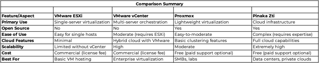 When it comes to virtualization and cloud platforms, not all solutions are created equal. Many organizations rely on tools like VMware ESXi, vSphere/vCenter, or even Proxmox for managing servers, but it’s essential to recognize the distinction between these and a true cloud platform like Pinaka ZTi Cloud, a validated and secure OpenStack-based solution.